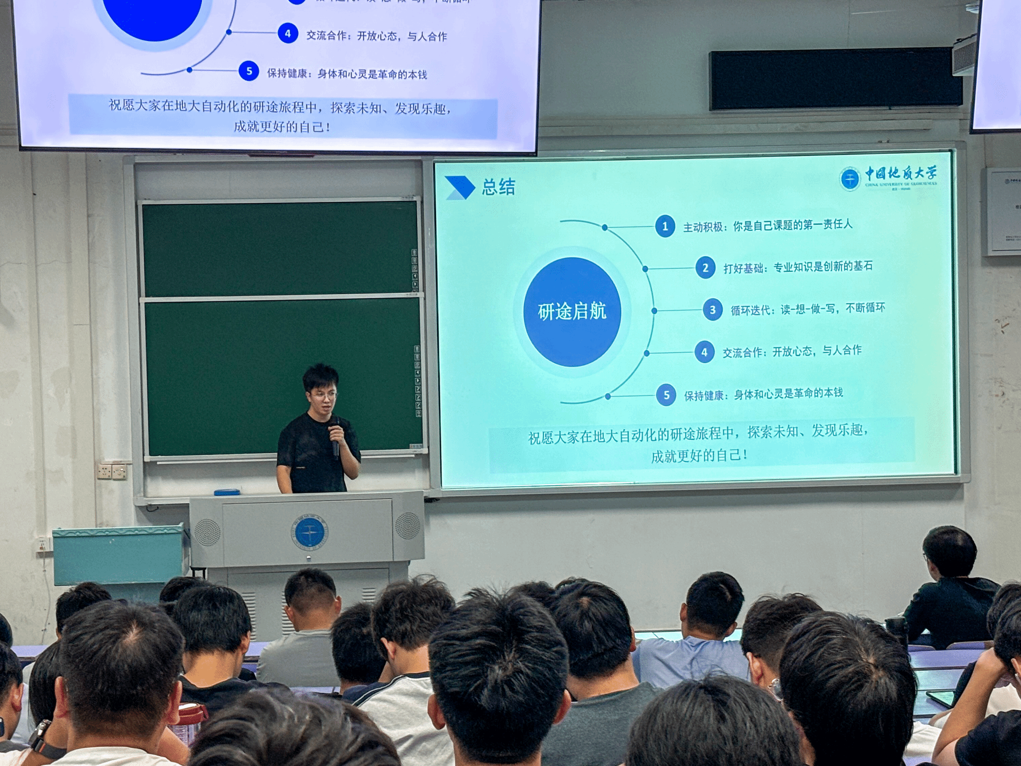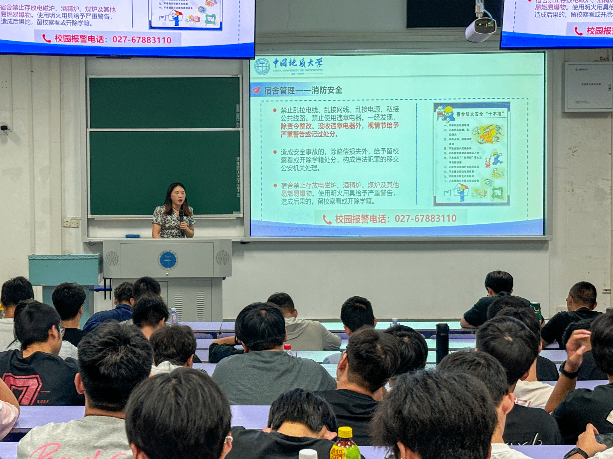 紧接着,研究生辅导员王艺霖老师从日常管理、安全教育与心理健康等多方面,逐条拆解,提醒同学们严格遵守制度规范,增强安全意识与责任意识,在兼顾学业的同时,也要保持健康的体魄和良好的心态。